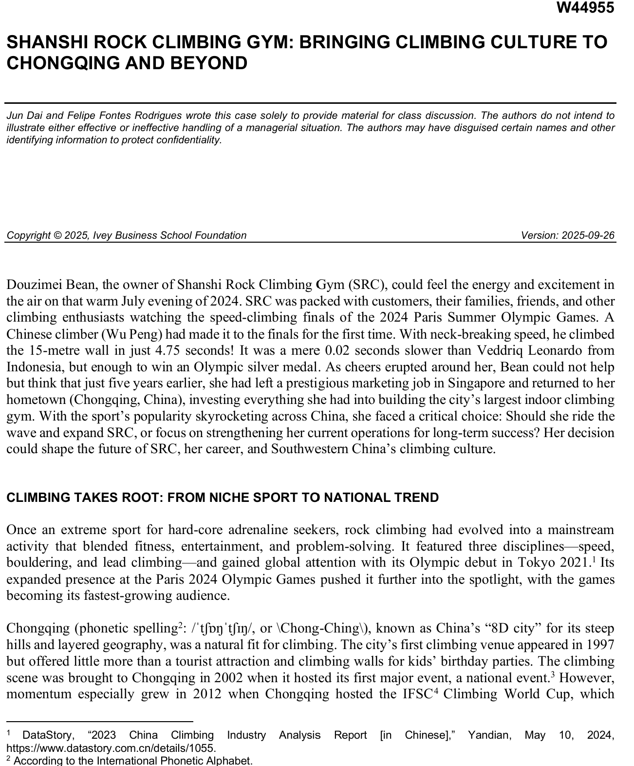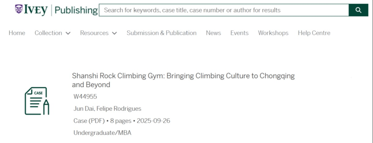 近日,beat365国际商学院教师代俊作为第一作者,联合该校长期合作大学——加拿大韦仕敦大学国王学院副教授 Felipe Rodrigues 共同撰写的教学案例《Shanshi Rock Climbing Gym: Bringing Climbing Culture to Chongqing and Beyond》(《山石攀岩馆:将攀岩文化引入重庆并走向世界》),正式被加拿大毅伟商学院案例库收录并面向全球发布。这是beat365教师首次以权威教学案例形式进入全球顶尖商学院课堂,实现了 “零的突破”,充分展现了学校在教学实践与学术建设方面的卓越水平,同时也标志着与加拿大韦仕敦大学国王学院的教学合作迈入全新阶段。
