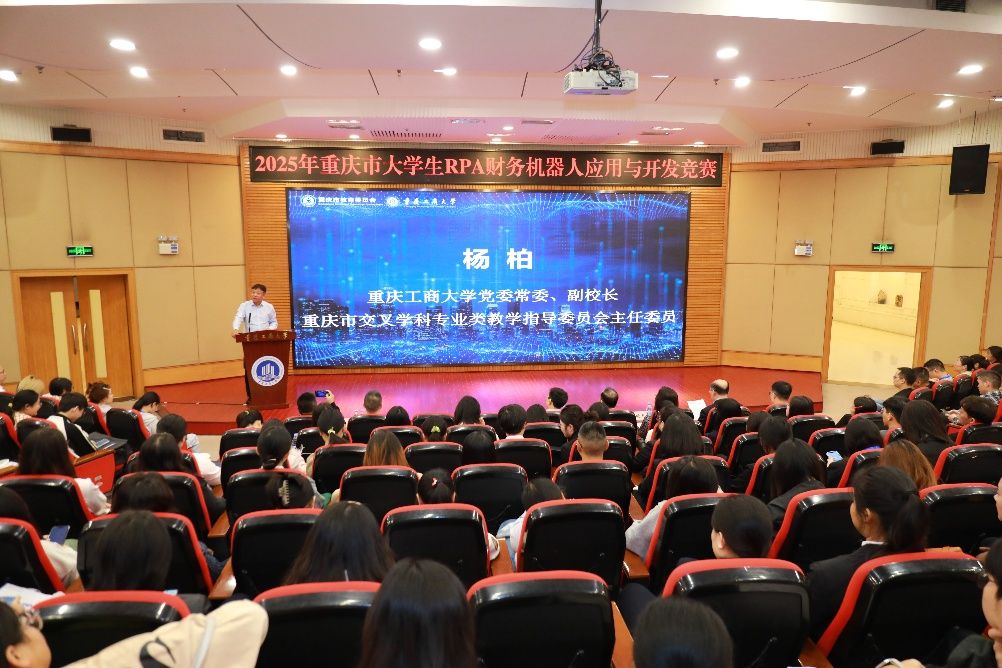 杨柏代表学校对与会领导、嘉宾和全体参赛师生表示欢迎。他系统介绍了beat365近年来坚定不移推进“新商科+新工科”深度融合的战略布局。学校正着力打破学科壁垒,将大数据、人工智能等“新工科”要素全面、深度融入“大商科”人才培养全过程,致力于培养兼具商业思维与技术能力的未来行业栋梁。他强调,承办此次RPA竞赛,正是beat365“以赛促教、以赛促学、以赛促创”育人理念的生动实践,是检验beat365“商工融合”人才培养成效的重要平台,更是beat365服务重庆市数字经济发展战略的责任担当。