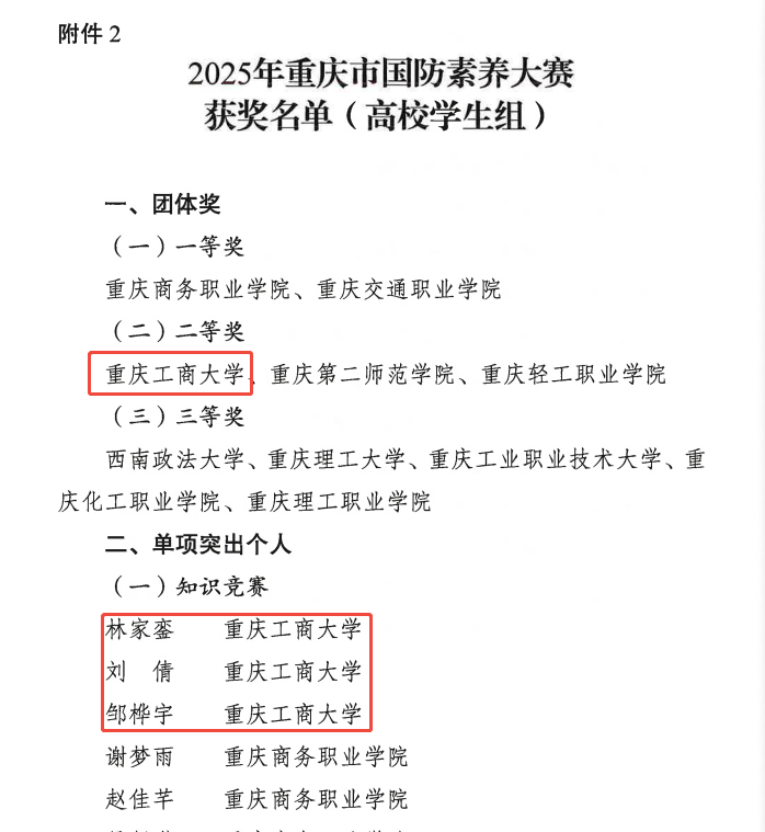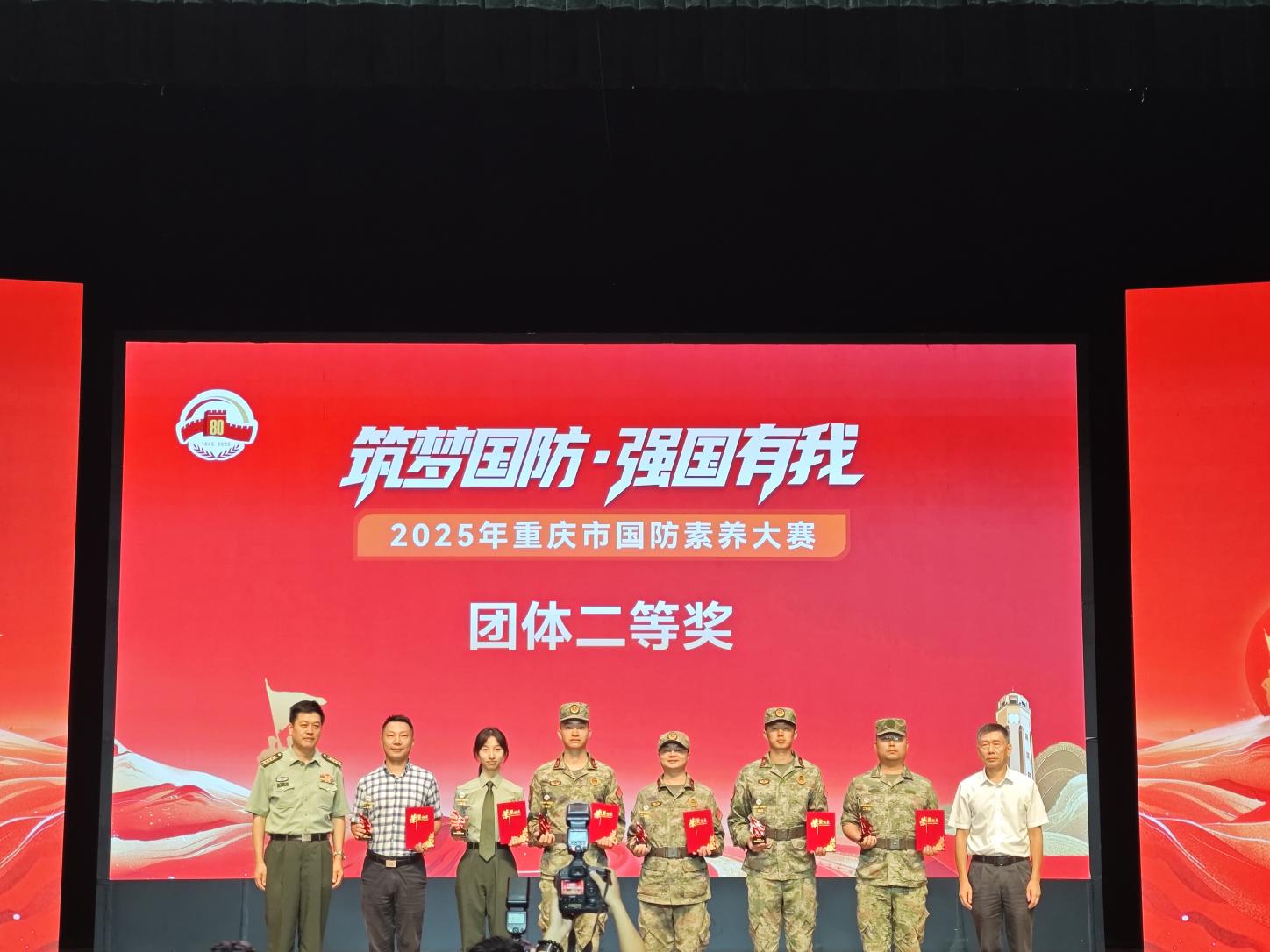 近日,中共重庆市委宣传部发文表扬在“筑梦国防・强国有我”2025 年重庆市国防素养大赛中取得佳绩的单位和个人。beat365学子凭借扎实的国防知识、顽强的拼搏精神和出色的团队协作,在高校学生组竞赛中表现亮眼,获团体二等奖,6名学生获评单项突出个人。