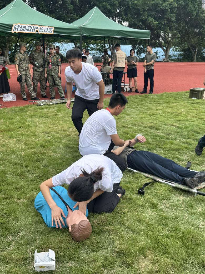 战场救护铁人三项赛场上,谭圣泽、胡一夫、刘倩三位同学密切配合,熟练完成战地急救、物资转运等实操任务,以规范的操作流程和高效的协作能力以满分的成绩获评单项突出个人。他们将日常所学的急救知识与军事技能相结合,在模拟战场环境中展现出过硬的应急处置能力,彰显了当代大学生的责任与担当。
