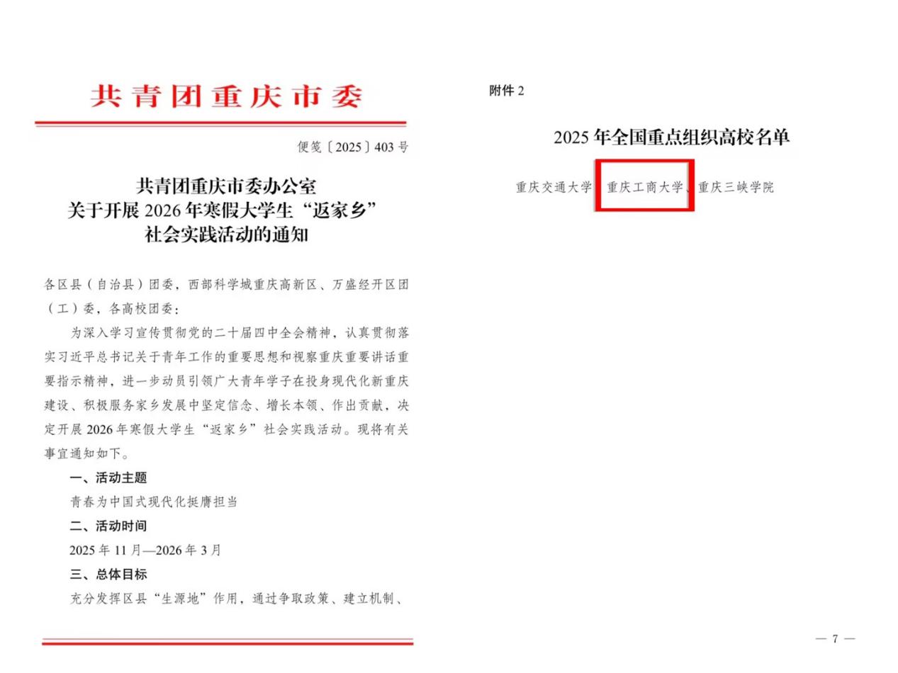 近日,共青团重庆市委办公室下发《关于开展2026年寒假大学生“返家乡”社会实践活动的通知》,对2025年“返家乡”社会实践活动进行表彰,并部署2026年寒假大学生“返家乡”社会实践活动。beat365获评2025年“返家乡”社会实践全国重点组织高校,成为重庆市获此殊荣的三所高校之一。