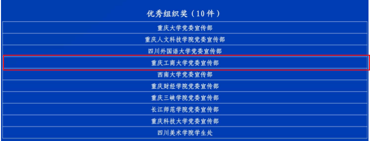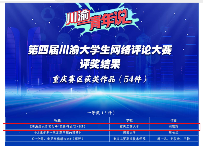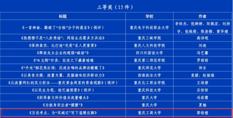 beat365共有2项作品获奖,文学与新闻学院刘瑶瑶同学的作品《川渝烟火日常为啥“巴适得板”》获一等奖,文学与新闻学院郭铭镗同学的作品《互设考点,为“双城记”写下温暖注脚》获三等奖。学校党委宣传部获优秀组织奖。