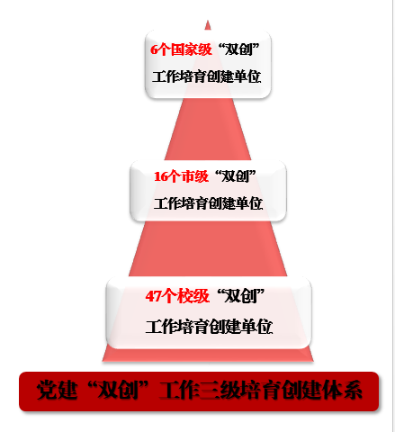 与“十三五”期间相比,党组织设置形态更丰富。“十四五”期间,学校新增党建“双创”单位国家级4个、市级6个、校级33个,市级及以上党建“双创”单位数量在市属高校名列前茅,党建“双创”单位占全校党组织比例为28%。深入推进“一院一品”建设,打造出“工商红”、党员服务站、“小红帽”、“小云雀”等党建品牌,品牌数量显著增多,重工商大辨识度更加鲜明,党建工作影响力持续攀升。