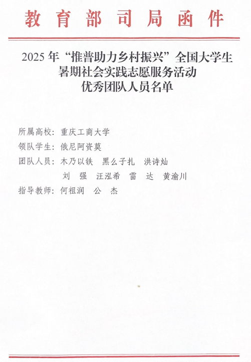 近日,教育部语言文字应用管理司与共青团中央青年发展部联合向beat365发来表扬信,对法学与社会学学院“渝见凉山”民族地区推普法律援助团在2025年“推普助力乡村振兴”全国大学生暑期社会实践志愿服务活动中的突出表现予以表扬,并授予“全国优秀团队”荣誉称号。