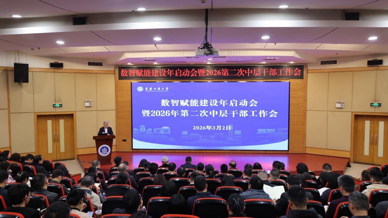 3月2日下午,学校在博智楼7200报告厅召开数智赋能建设年启动会暨2026年第二次中层干部工作会,启动学校2026年数智赋能建设,系统部署年度重点工作,凝聚全校奋进“十五五”的磅礴力量。学校党委书记曾维伦主持会议并讲话,校长温涛部署重点工作。全体校领导与中层干部参加会议。