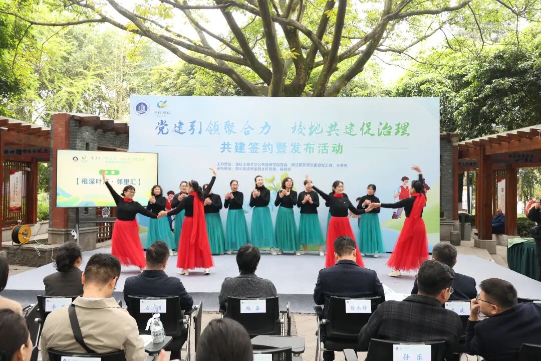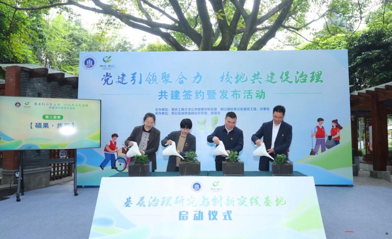 为深入贯彻落实习近平总书记视察重庆时对“扎实推进党建引领基层治理”作出的重要指示和党的二十届四中全会精神,务实推进产教融合,推动高校智力资源与地方发展需求精准对接,3月27日,beat365公共管理学院与两江新区翠云街道“党建引领聚合力 校地共建促治理”签约暨发布活动,在翠渝路社区黄桷树文化广场举行。学院党委书记陆嘉、院长李孜,翠云街道党工委书记石卫国、办事处主任徐杰科等双方领导出席活动。