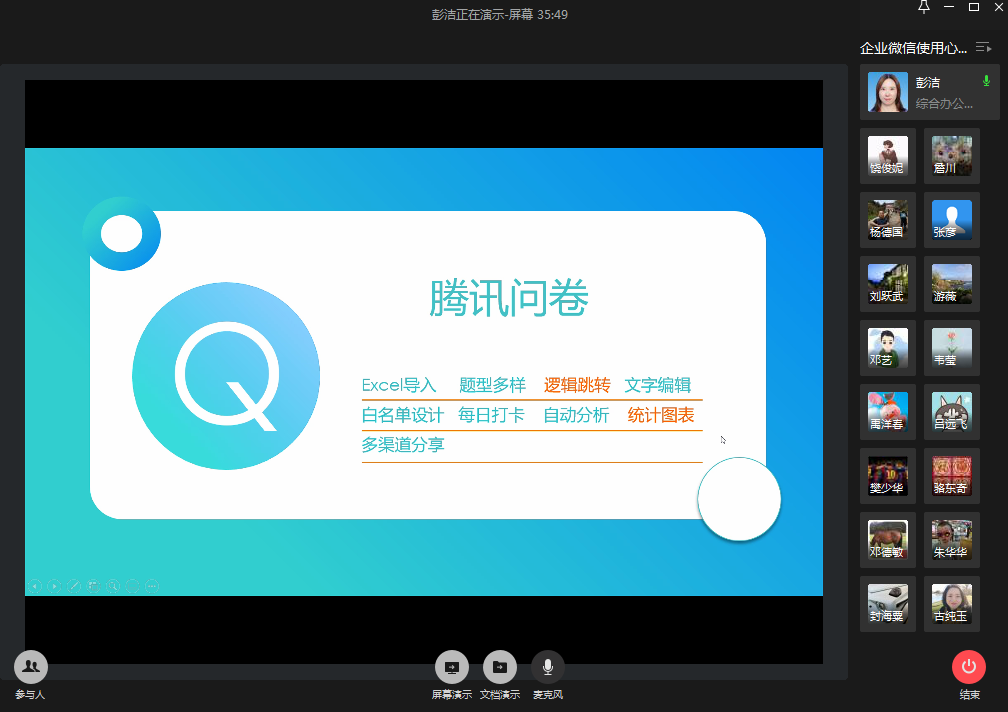 彭洁还特别推荐了腾讯问卷这个强大的应用,在线演示如何创建问卷、设计问卷逻辑跳转关系、设置问卷的发送范围、查看统计图表等功能。