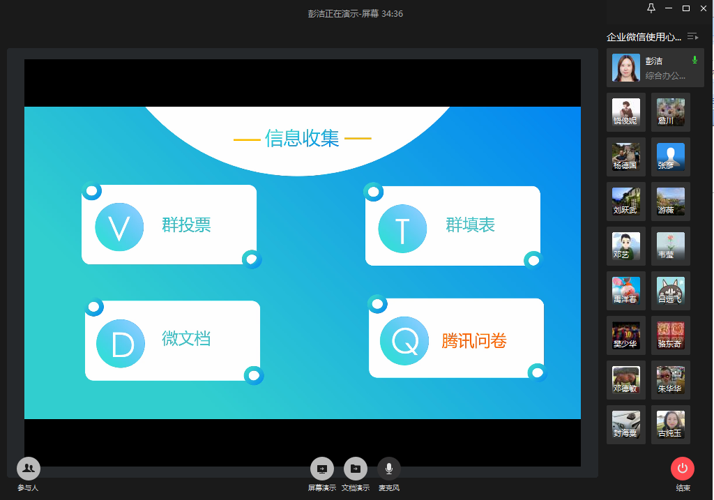 在会上,学院综合办副主任彭洁首先为大家介绍了这段时间她使用企业微信的心得,以及她利用企业微信在信息传递、数据收集、协同办公等方面的一些设计和体会。她分享了如何利用企业微信快速、准确地实现信息的分类推送,提高行政工作的沟通效率。详细介绍了如何利用企业微信中“群投票”、“群填表”、“微文档”、“收集表”等不同工具的实现数据的收集、汇总工作,并且对这四种工作各自的应用范围、优势以及限制做了概括。