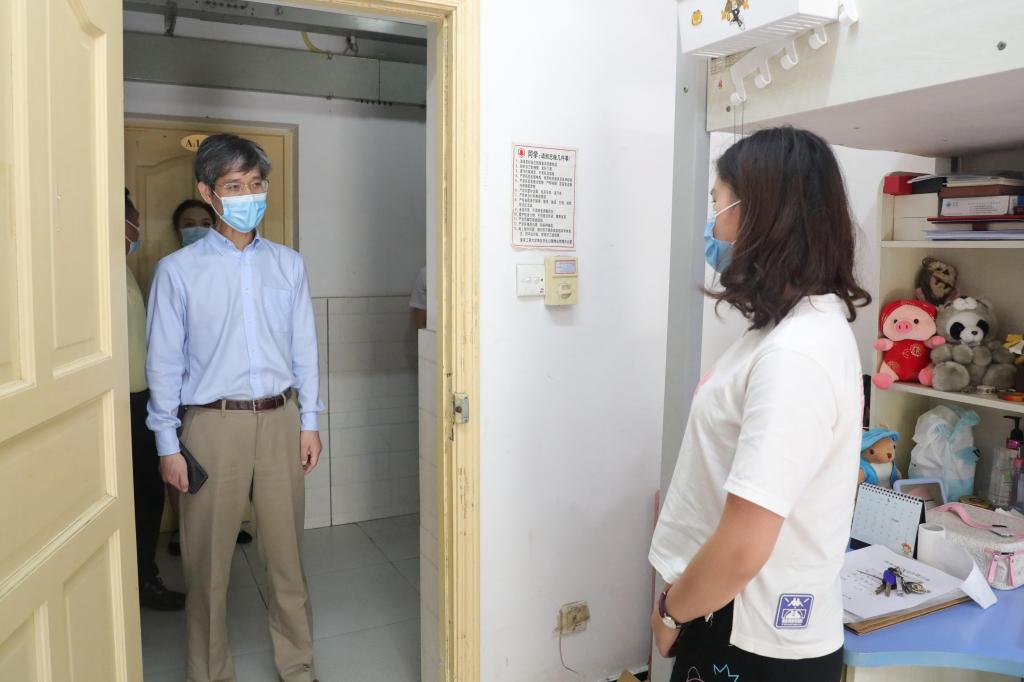 孙校长一行还深入宿舍楼栋了解学生返校后的入住情况,消毒杀菌、清洁卫生、体温监测工作开展状况等,关心毕业生的毕业论文完成进度和就业情况,嘱咐返校学生要注意安全,科学防疫,祝福他们顺利完成学业。