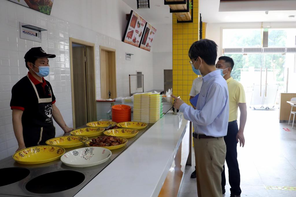 孙校长一行先后走访了南岸校区和兰花湖片区多个食堂,查看了餐厅疫情防控状况;询问返校学生在餐厅的餐具使用、取餐、用餐、错峰就餐等工作环节;强调要高度重视疫情期间餐厅工作的各项细节,确保食品安全和返校学生的用餐安全。