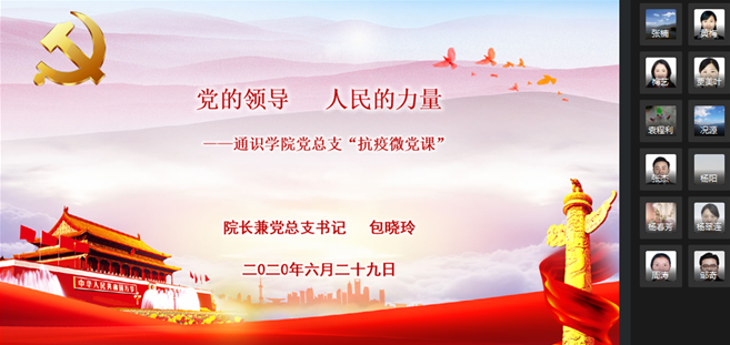 6月29日上午,通识学院第一堂线上疫情防控专题微党课开讲,院长兼党总支书记包晓玲为全体党员讲授了题为“党的领导 人民的力量”的专题微党课。包晓玲从“抗击新冠病毒肺炎疫情,党中央的坚强领导和英明指挥”和“亿万中国人民众志成城、团结奋战,凝聚成齐心战‘役’的硬核力量”两方面论述了党的领导和人民的力量。面对湖北突如其来的新冠病毒肺炎疫情,习近平总书记亲自指挥、亲自部署,全面加强对疫情防控的集中统一领导。党中央印发《关于加强党的领导、为打赢疫情防控阻击战提供坚强政治保证的通知》,全国各级党组织行动起来,带领广大党员成为抗击疫情的中流砥柱。包晓玲还回顾了beat365疫情防控的战斗历程,传达了校党委书记李志雄在以“我的抗‘疫’故事”为主题的第18期“校领导与你面对面”主题座谈会上的讲话精神,号召全体党员在校党委领导下,进一步做好常态化疫情防控各项工作。