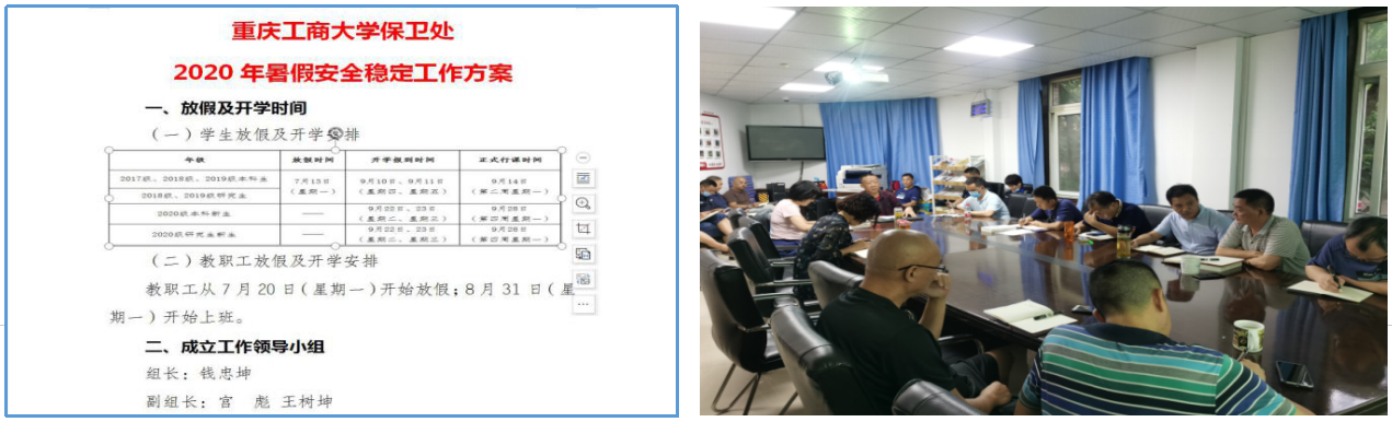 为圆满完成暑期校园封闭式管理和安全稳定工作,根据7月16日学校第五次中层干部会议精神和《关于2020年暑假放假及开学安排的通知》安排,按照分管校领导的要求,保卫处高度重视,提前制定了《beat365英国官网网站保卫处2020年暑假安全稳定工作方案》,细化了《beat365英国官网网站保卫处2020年暑期值班安排表》,并于7月17日上午召开全处干部大会,对暑期校园疫情防控和安稳工作进行了周密部署。
