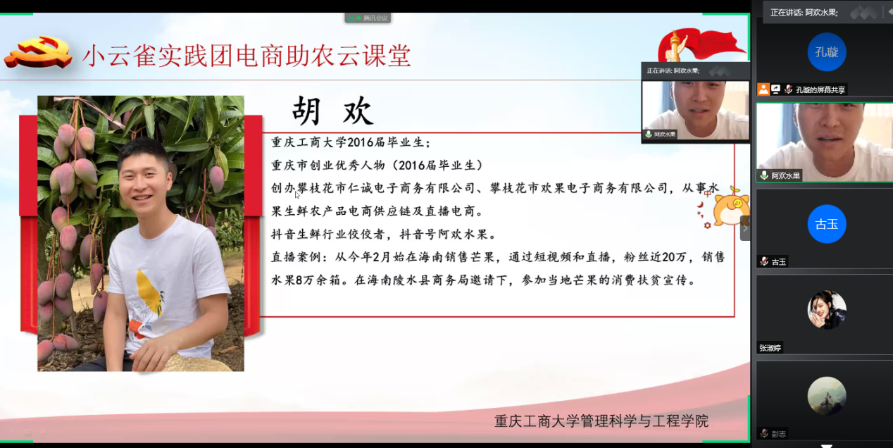 7月28日下午两点,管理科学与工程学院电商助农云课堂正式开始。学院陈春洁副书记首先致辞,欢迎胡欢和史亚飞的到来。胡欢是重庆市创业优秀人物,抖音生鲜行业的佼佼者,创办了欢果电子商务有限公司,