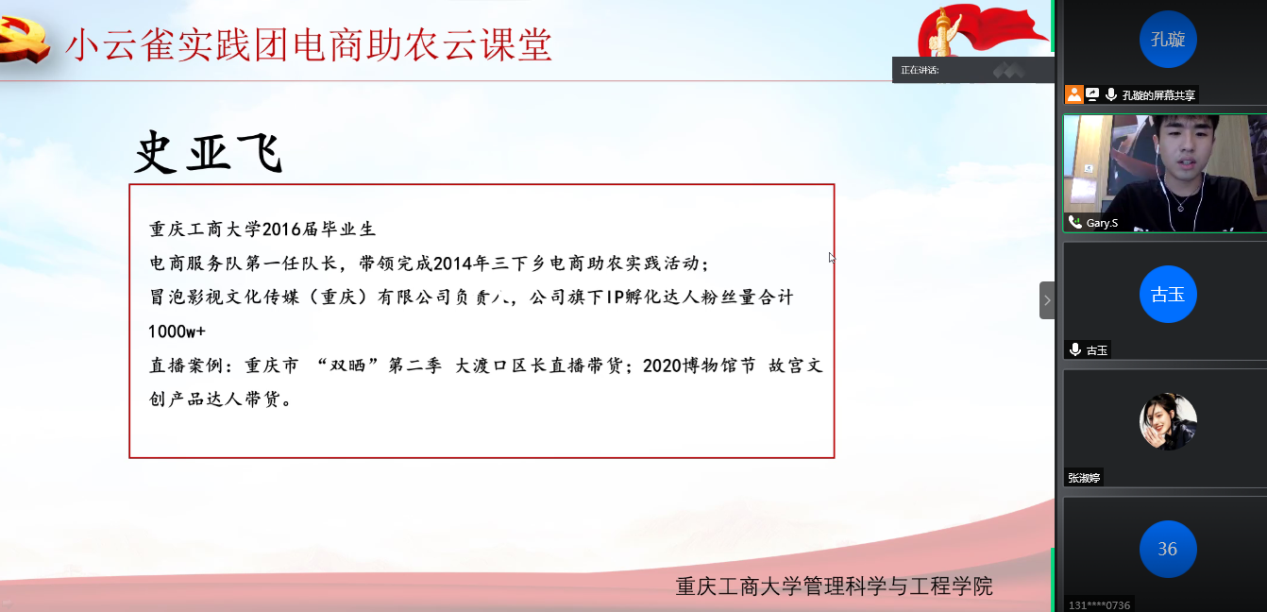 分享会上,两位在直播领域有着优秀成就的校友结合实践经历与本次活动主题进行培训交流。胡欢分享了自身创业经历,介绍了生鲜直播电商。史亚飞则就直播电商的总体情况进行介绍,并分享了电商直播带货的途径、操作方法及注意事项等。校友分享结束后,同学们和老师们踊跃提问 与校友开展了热烈的讨论。大家一同探讨电商助农的方式方法,为脱贫攻坚贡献力量。