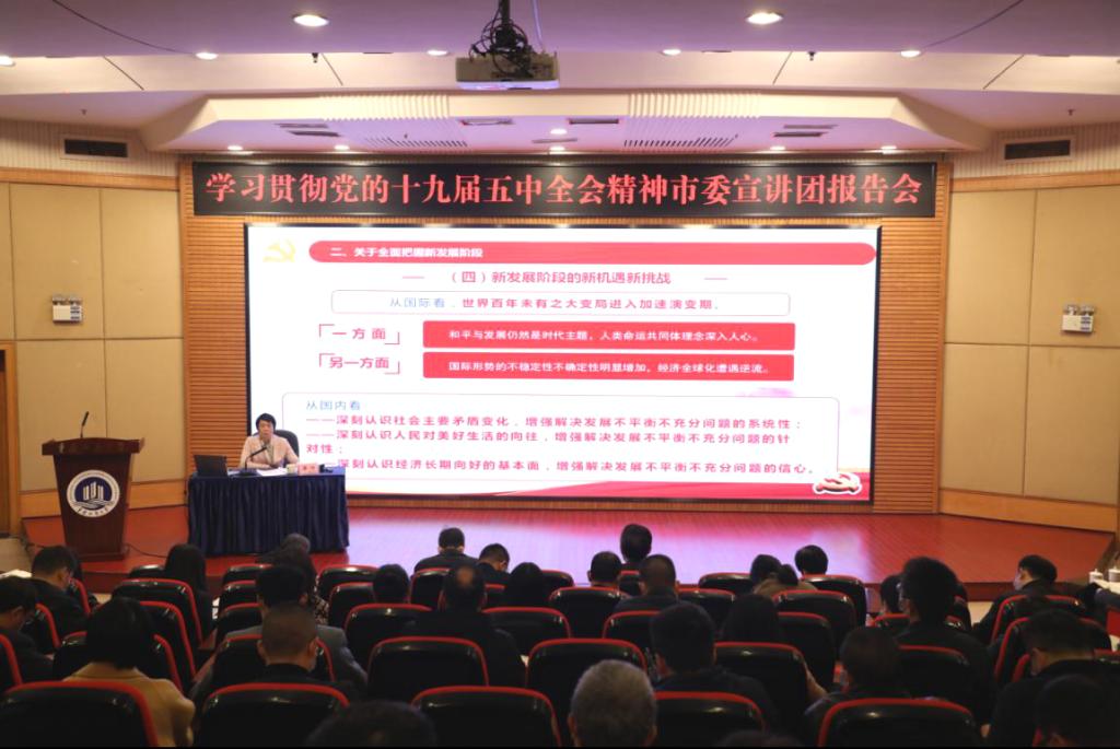 报告会上,薛竹同志围绕习近平总书记在党的十九届五中全会上的重要讲话精神,从全会的基本情况,全面把握新发展阶段,准确领会2035年远景目标和“十四五”时期我国发展的指导方针、主要目标、重点任务,深刻认识构建新发展格局,坚持党的全面领导,动员各方面力量为实现“十四五”规划和2035年远景目标而团结奋斗等五个方面,结合经济社会发展实际情况,结合高等教育改革发展和青年大学生如何与祖国发展同心同向同行,对党的十九届五中全会精神进行了全面准确的宣讲。