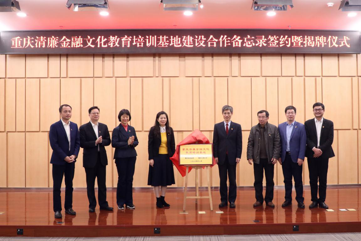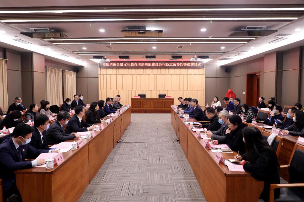 赵骅和徐静代表双方签订重庆清廉金融文化教育培训基地建设协议。孙芳城和蒋平为重庆清廉金融文化教育培训基地揭牌。
