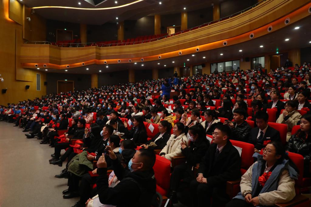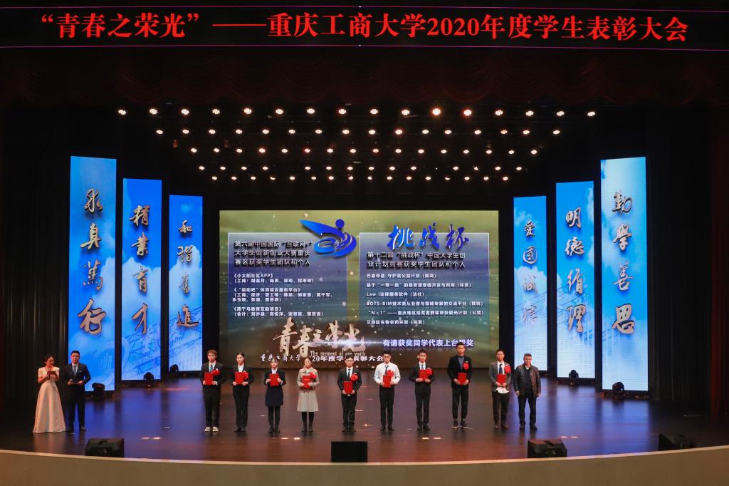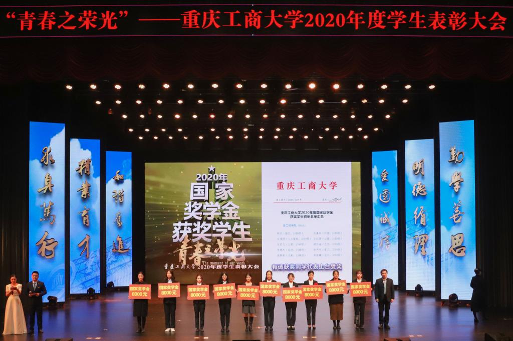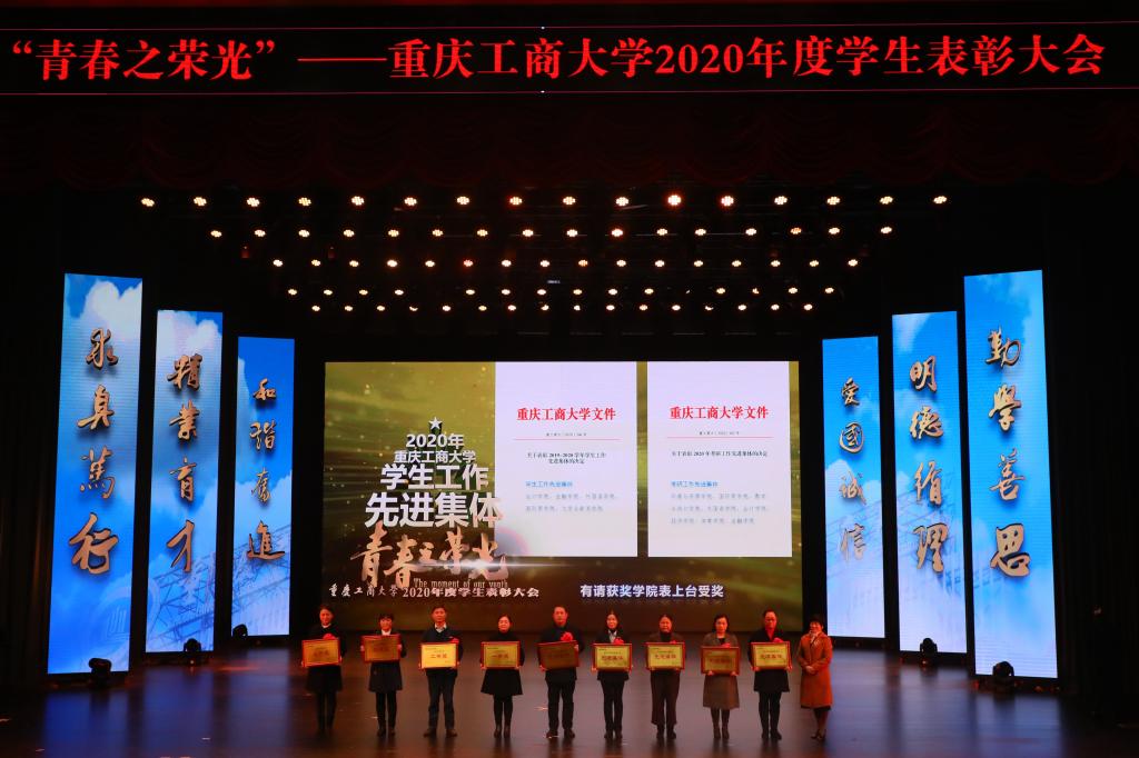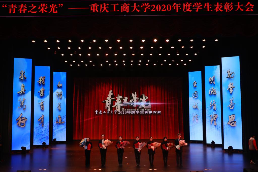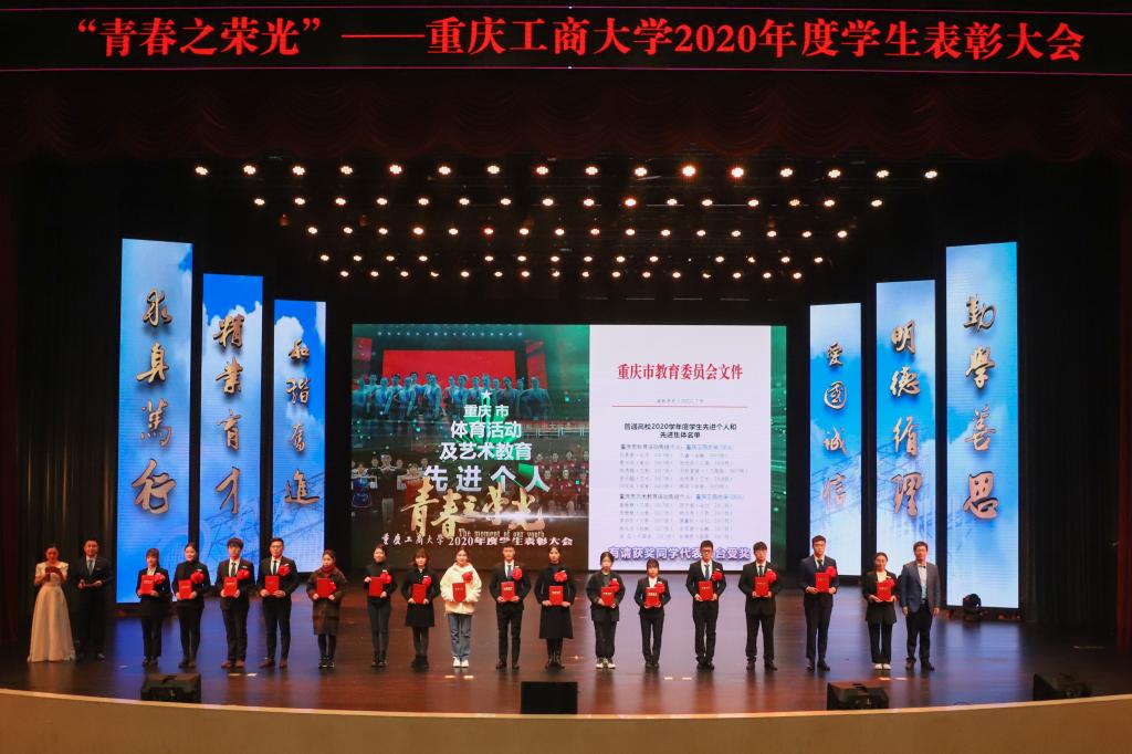 12月28日,2020年度学生表彰大会在图书馆剧场隆重召开,对2020年表现突出的先进集体(团队)和优秀个人进行表彰,激励广大学生爱国荣校勇担当、刻苦学习重实践,做新时代“爱国、励志、求真、力行”的好青年。党委书记李志雄,校长孙芳城,党委副书记宋豫,副校长陈运超,纪委书记周航,副校长李国军、李敬,校长助理谭松涛,杰出校友代表、重庆机场集团有限公司监理会主席黄伟,学校相关职能部门负责人,各学院领导,教师代表,校友代表及学生代表700余人参加了表彰大会。通识学院辅导员秦杉、管理科学与工程学院辅导员封海粟主持了表彰大会。