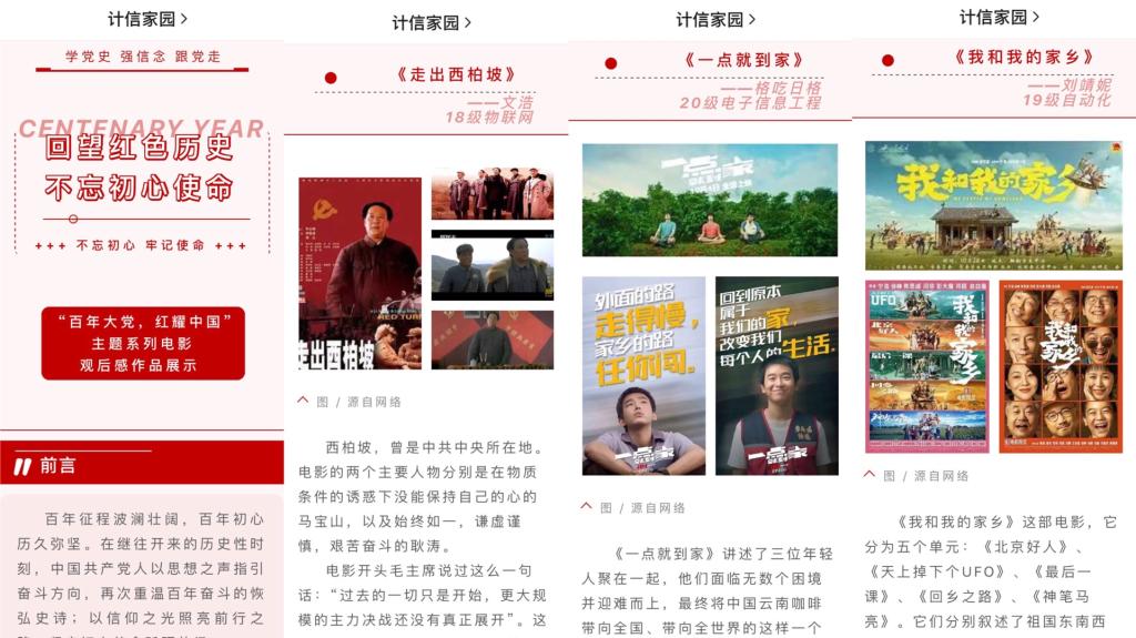 在“百年大党,红耀中国”主题观影活动中,通过观看《走出西柏坡》《邓小平1928》《我和我的家乡》等影片,大家以笔抒情,纷纷在观后感中回顾党的奋斗历史,讴歌党的光辉业绩,抒发爱党之情。