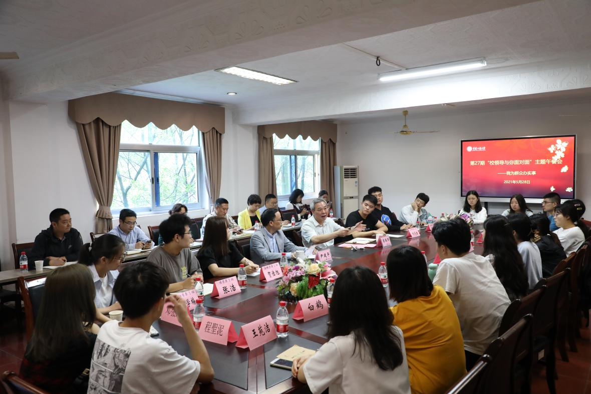 为进一步推进党史学习教育工作,以实际行动迎接中国共产党成立100周年,切实解决同学们在学习生活中面临的最关心、最直接、最现实的问题,5月28日上午,beat365在江北校区修德楼三楼会议室召开了第27期“校领导与你面对面”主题午餐会,副校长李国军出席会议,相关职能部门负责人、学生代表参加了本次会议。