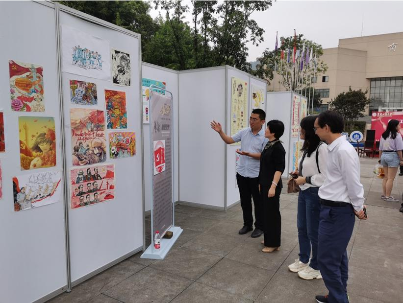 在场师生共同参观了现场作品。展览现场分为课说党史、画说党史、手工艺、绘画、创意设计、人工智能、机械工程、摄影等多个展区,作品涵盖多方向专业领域,形式多样,内容丰富,参展作者以独特的创意表达、鲜活的艺术形态、别致的文化魅力绘制作品,共同构筑了一场展现学生青春风采、烘托校园美育氛围的视觉盛宴。