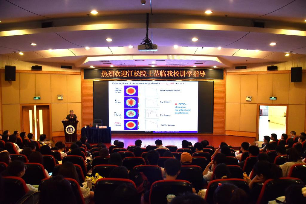 江松在博智楼7200学术报告厅为广大师生作了题为《灰色辐射传输方程的正渐进保持滤波PN方法》的学术讲座。讲座由学校党委常委、副校长柏群主持。整场报告内容丰富、深入浅出,赢得了广大师生的阵阵掌声。在互动环节,江松对现场师生的提问作了详细解答,并就大家关心的一些相关科研问题、学科建设问题进行了交流探讨。
