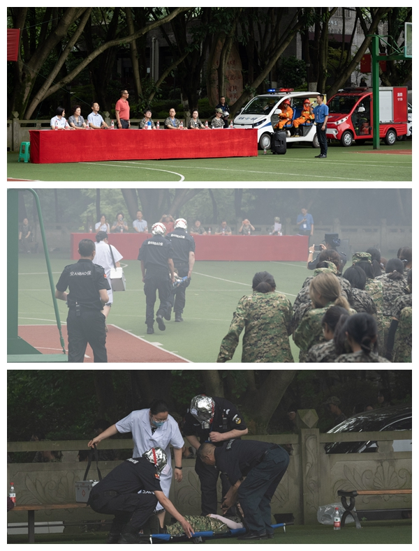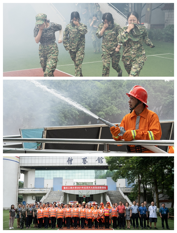 为了进一步普及安全知识,增强安全意识,提高自防自救能力,检验相关部门处置突发事件的能力,提升学校安全管理水平,7月9日上午,党委保卫部(保卫处)、党委学工部(学生处)在学校体艺馆联合举行了beat365英国官网网站2021年反恐灭火应急疏散演练,部分正在军训的学生、军训教官和老师、安保队员、平安校园志愿者、保卫干部、物业管理人员和校医院医务人员共计3300余人参加了演练。