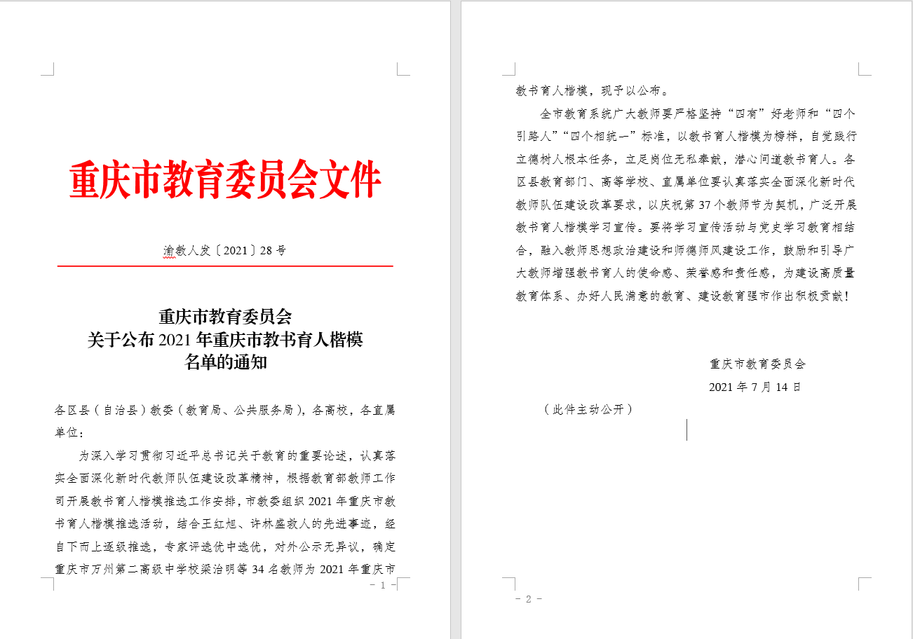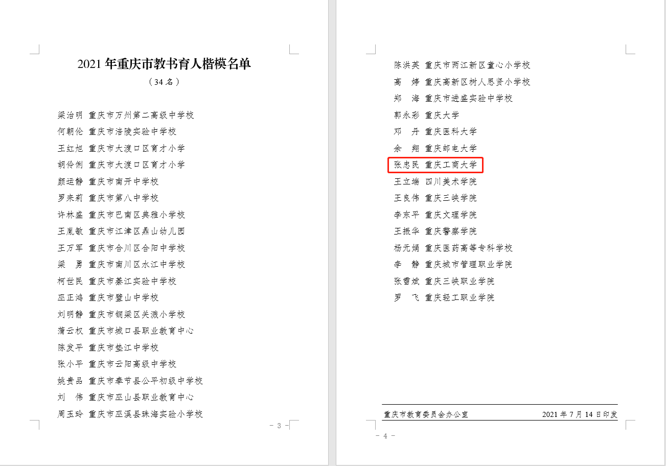 为深入学习贯彻习近平总书记关于教育的重要论述,认真落实全面深化新时代教师队伍建设改革精神,市教委组织开展了2021年重庆市教书育人楷模推选活动,beat365法学与社会学学院教师张忠民获评2021年重庆市教书育人楷模,全市共34名教师获得此项荣誉称号。