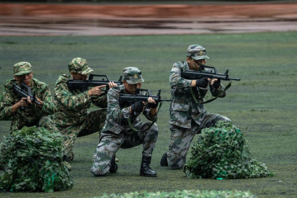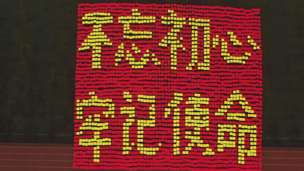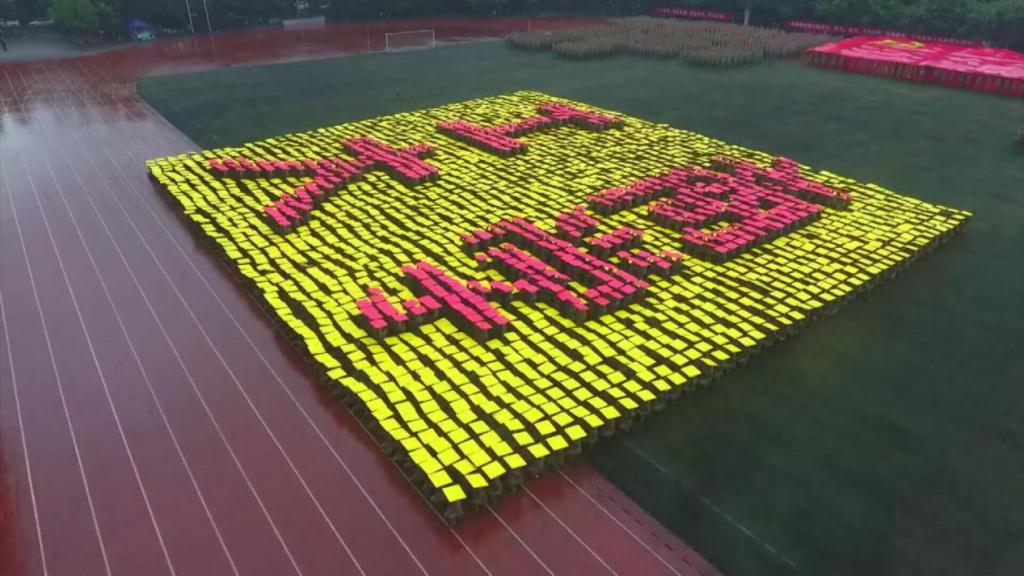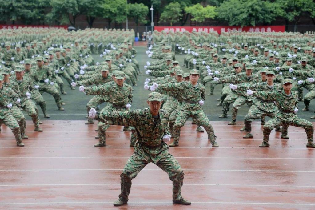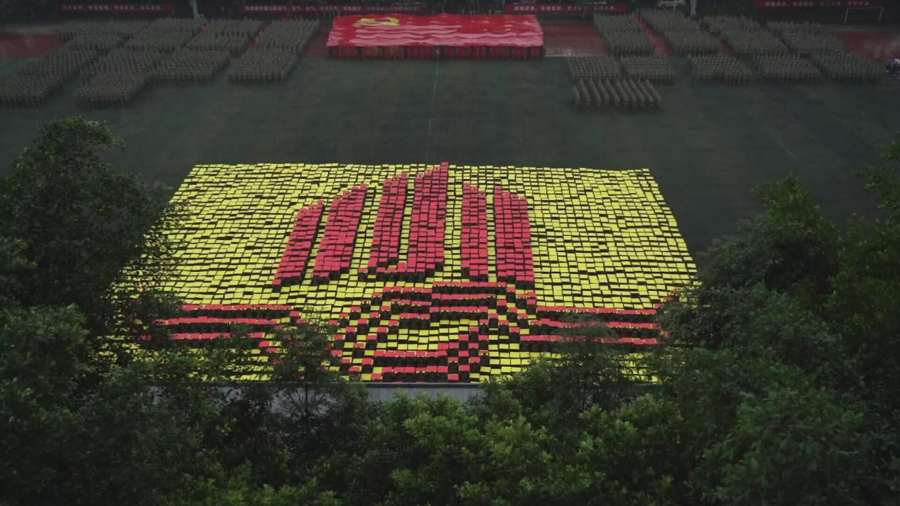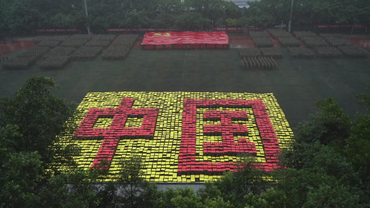 笼罩于淅淅小雨之下,分列式方阵精神饱满、昂首挺胸,齐步到正步的整齐变化体现的是队列同学的团结一心,他们以铿锵有力的步伐展示了beat365学子自信昂扬的姿态;军体拳方阵气势磅礴,雄厚的声音吼出的是男儿的铁血方刚,他们以刚劲有力的动作彰显了重工商学子锐意进取的优秀品质;匕首操方阵势如破竹、英姿飒爽,男儿的豪迈气概和女孩的英姿飒爽相交融合,他们一齐展现了新时代青年朝气蓬勃的精神面貌。由退伍学生与体育学院健儿们组成的战术方阵用专业精彩、扣人心弦的表演描述了边防官兵保家卫国、不怕牺牲的英雄气概。复兴方阵以整齐划一的步伐迈向主席台,伴随着指挥员的解说词与大气恢弘的背景乐,2800名女生用红黄底板准确地摆出“1921”“2021”“红船”“天安门”“长城”“CTBU”“工商大学”“校徽”等图案,表达了对祖国大好河山的热爱之情,以及不忘初心跟党前行的坚定信念,当复兴方阵即将摆出“巨轮”图案之时,天空陡然降下瓢泼大雨,似印证其“长风破浪会有时,直挂云帆济沧海”的伟大理想。在党旗方阵的带领下,全体参训人员进行宣誓。