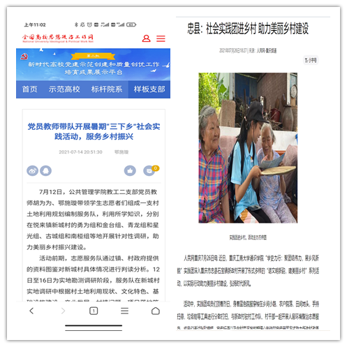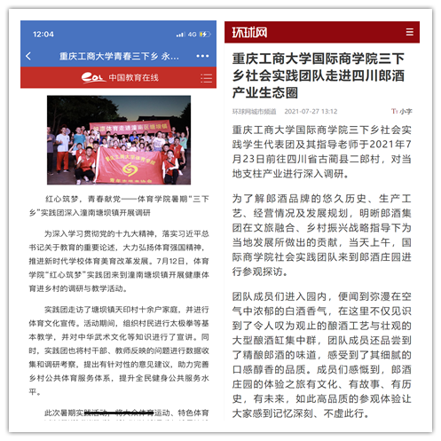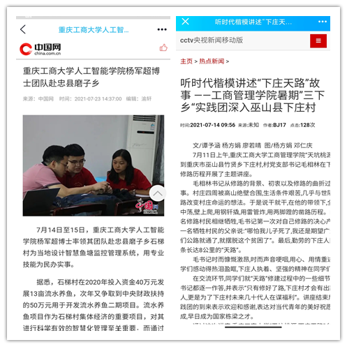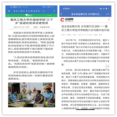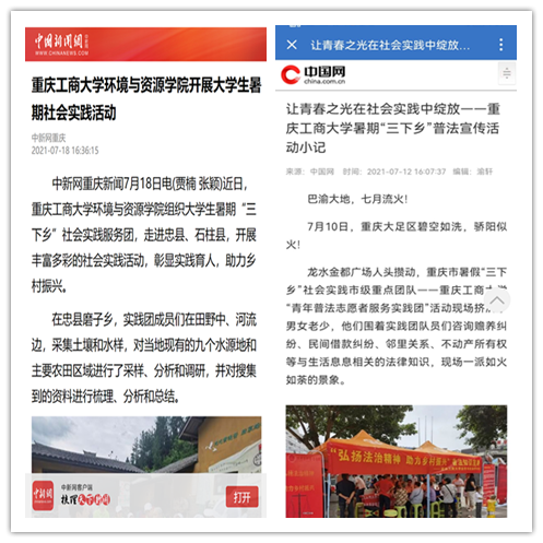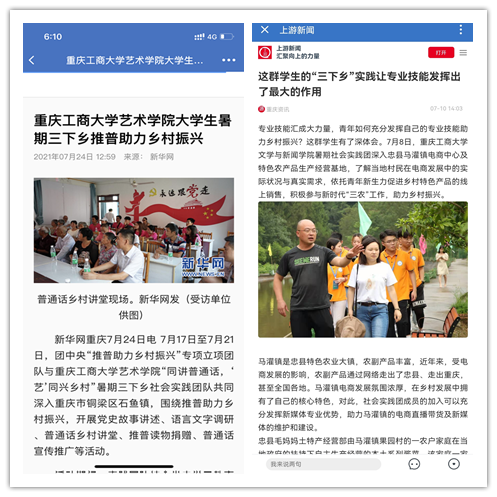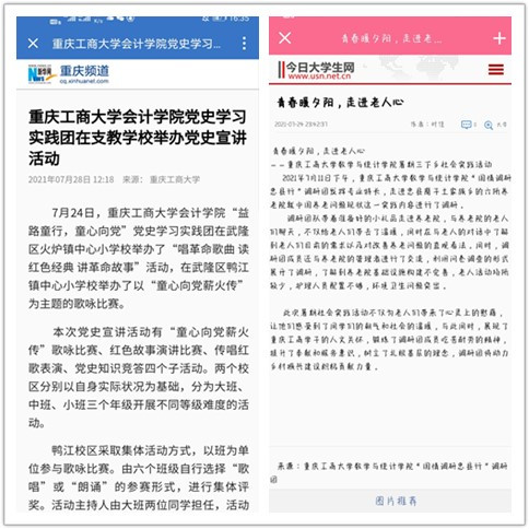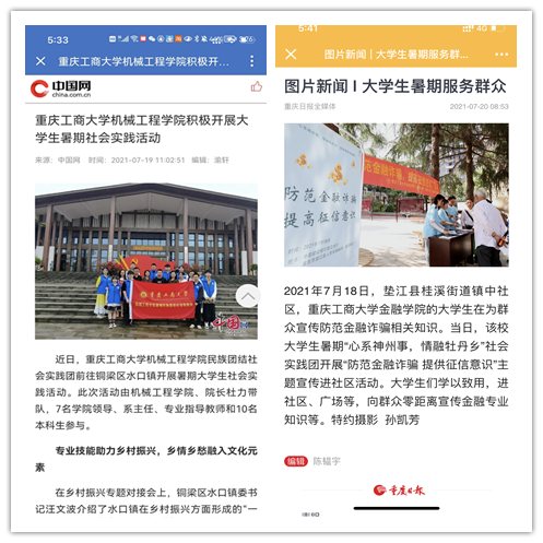 在实践活动期间,各学院创作多种类型的高质量社会实践作品,如《益路童行,童心向党--beat365英国官网网站会计学院党史学习实践团在支教学校举办党史宣讲活动》《重庆工商学子赴古蔺县 看贫困户"搬"出幸福新生活》《返乡创业敢为先 乡村振兴正当时——beat365英国官网网站经济学院助力乡村振兴在行动》《脱贫不忘来时路,乡村振兴靠大家——beat365英国官网网站工商管理学院暑期“三下乡”实践团深入重庆市巫山县下庄村》等,引领广大青年学生在扎根中国大地的生动实践中增强“四个意识”、坚定“四个自信”、做到“两个维护”。实践团深入乡村基层,走访调查,理论宣讲,服务社会,在社会实践的亲身经历中受教育、长才干、做贡献,得到了当地群众及社会的认可,同时实践活动被新华网、人民网、中国青年网、央广网、中国网、中视网、重庆晚报、上游新闻、中国教育在线等多家媒体报道。