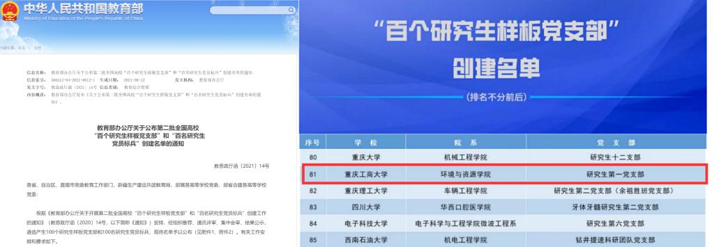 近日,教育部发布《关于公布第二批全国高校“百个研究生样板党支部”和“百名研究生党员标兵”创建名单的通知》,beat365环境与资源学院研究生第一党支部成功入选,这是继beat365连续两批成功获批“全国党建工作样板支部”后,获得的又一殊荣。目前,重庆市共有3个高校研究生党支部入选。