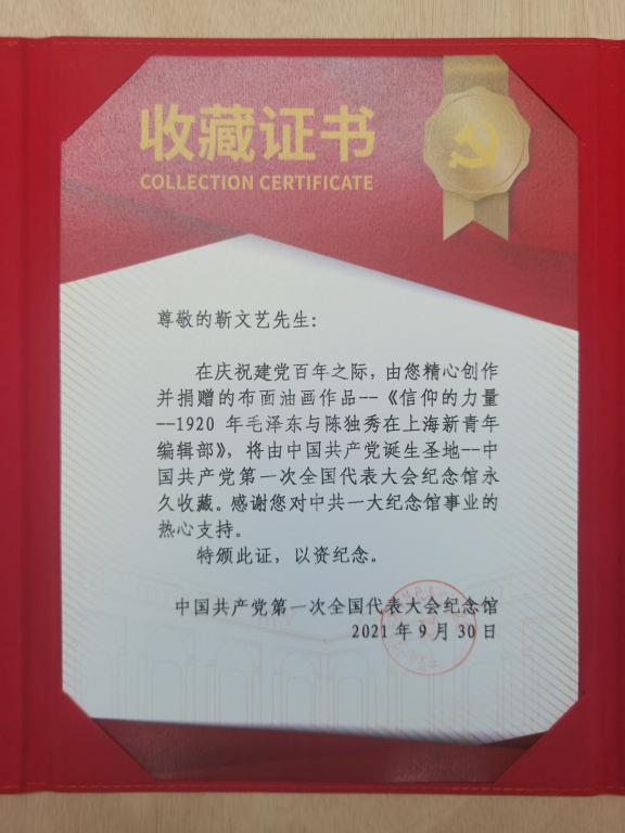 这幅油画作品长3.2米,高2.1米,是目前中共一大纪念馆收到的最大尺寸的油画捐赠作品。“今年,是中国共产党成立100周年。我把这幅作品无偿捐赠给国家、捐赠给中共一大纪念馆收藏,希望能够让更多的观众看到。作为一名党员艺术家,也是为宣传建党精神尽一份力,历史作品放在历史发生地更有意义。”靳文艺如是说。