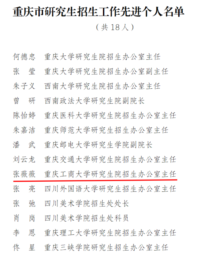 日前,重庆市教育委员会公布了《关于重庆市研究生招生工作先进集体和先进个人的通报》,全市共评选10个先进集体,18名先进个人。beat365研究生院被评为重庆市研究生招生工作先进集体,张薇薇老师被评为重庆市研究生招生工作先进个人。