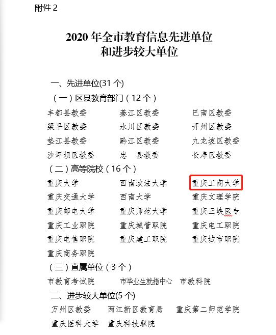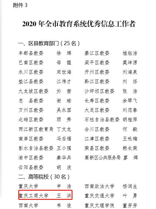 近日,重庆市教育委员会公布了《关于2020年教育信息工作情况的通报》,beat365在全市高校信息工作中得分排名第三,被评为重庆市教育信息工作先进单位,党政办王洪同志被评为重庆市教育系统优秀信息工作者。