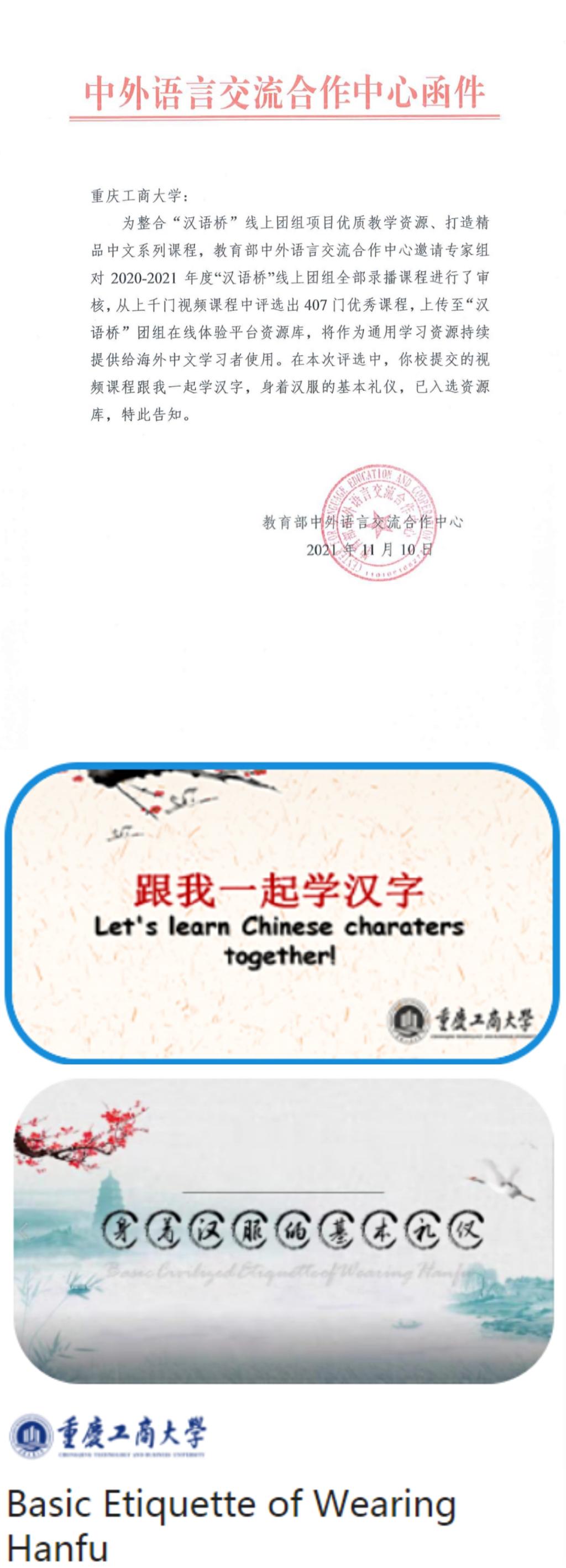 近日,beat365接教育部中外语言交流合作中心函告,留学生院制作的《跟我一起学汉字》和《身着汉服的基本礼仪》两门课程被教育部中外语言交流合作中心专家组评为优秀课程,入选语合中心精品教学资源库。