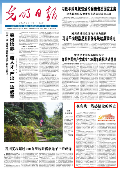 3月24日,《光明日报》在头版以“在实践一线感悟党的历史”为题报道了beat365学生学习感悟党史的典型案例。