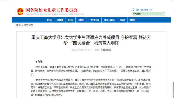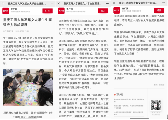 近日,中国妇女报、央广网等媒体报道了beat365发起并推广的女大学生生涯适应力养成项目。该项目依托会计学院心理工作站及beat365辅导员工作室,围绕女大学生生涯适应力提升目标,通过媒体融合、人员融合和阶段融合,借助多样化活动,致力于协助女大学生个人成长和职业发展。相关报道被国务院妇女儿童工作委员会官方网站、腾讯网、搜狐网等多家媒体转载。
