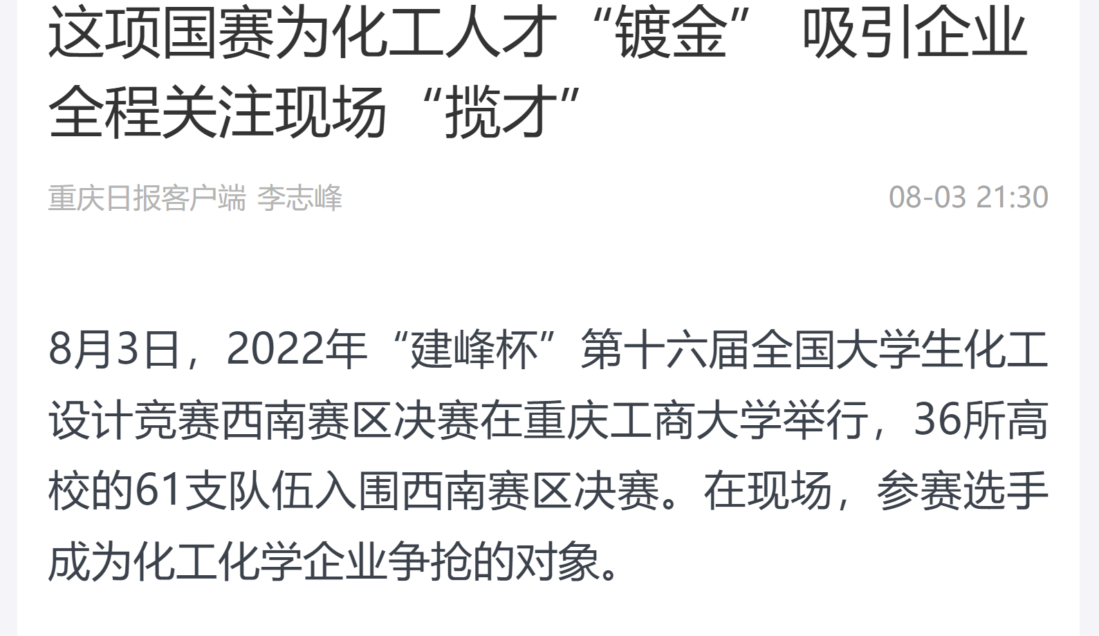 重庆日报报道beat365承办2022年“建峰杯”第十六届全国大学生化工设计竞赛西南赛区决赛