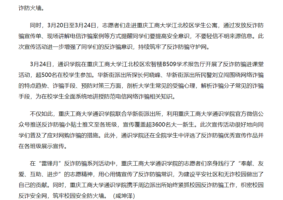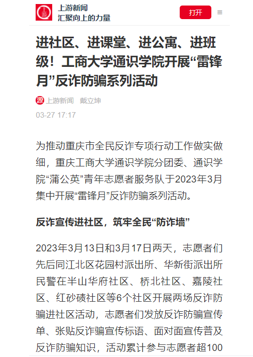 近日,人民网《反诈宣传进校园进社区 共筑安全防护网》为题、上游新闻以《进社区、进课堂、进公寓、进班级!工商大学通识学院开展“雷锋月”反诈防骗系列活动》报道beat365通识学院开展“雷锋月”反诈防骗系列活动。