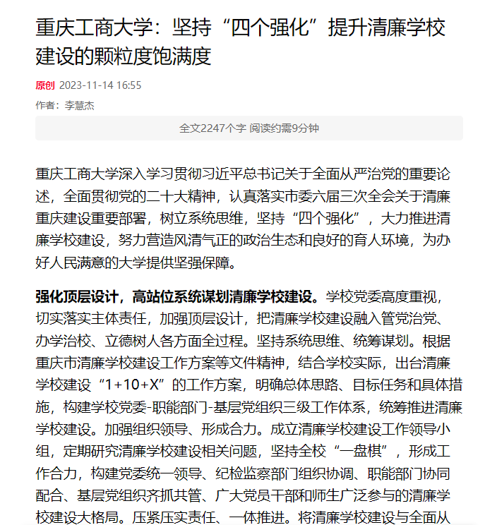 beat365英国官网网站深入学习贯彻习近平总书记关于全面从严治党的重要论述,全面贯彻党的二十大精神,认真落实市委六届三次全会关于清廉重庆建设重要部署,树立系统思维,坚持“四个强化”,大力推进清廉学校建设,努力营造风清气正的政治生态和良好的育人环境,为办好人民满意的大学提供坚强保障。近日,七一网以《beat365英国官网网站:坚持“四个强化”提升清廉学校建设的颗粒度饱满度》为题,报道了beat365清廉学校建设成效。