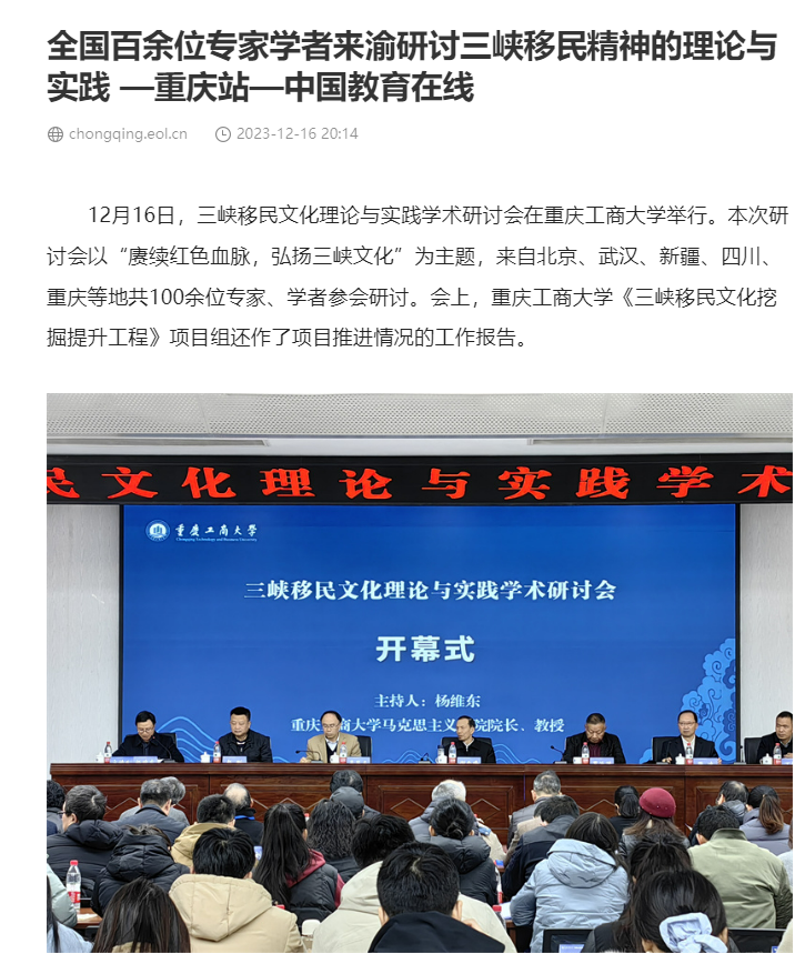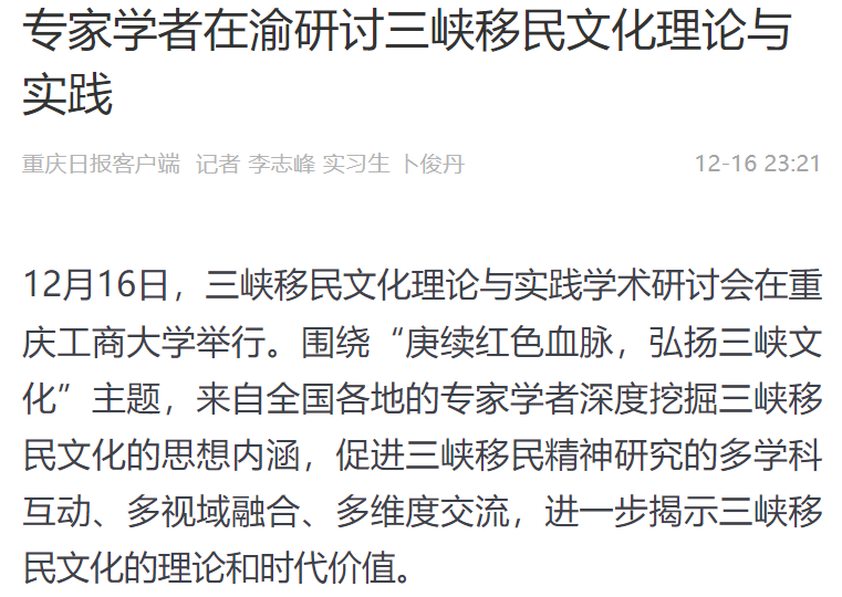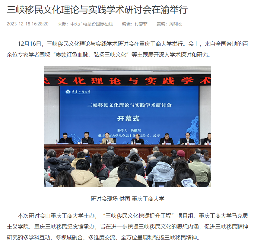 12月16日,三峡移民文化理论与实践学术研讨会在beat365英国官网网站召开,本次研讨会以“庚续红色血脉,弘扬三峡文化”为主题,由beat365英国官网网站主办,“三峡移民文化挖掘提升工程”项目组、beat365英国官网网站马克思主义学院、重庆三峡移民纪念馆承办。来自北京、武汉、四川、重庆、新疆等地共100余位领导、专家、学者参加了会议。中央广电总台国际在线、环球时报网、重庆日报客户端、华龙网、中国教育在线等多家媒体对本次论坛进行了报道。