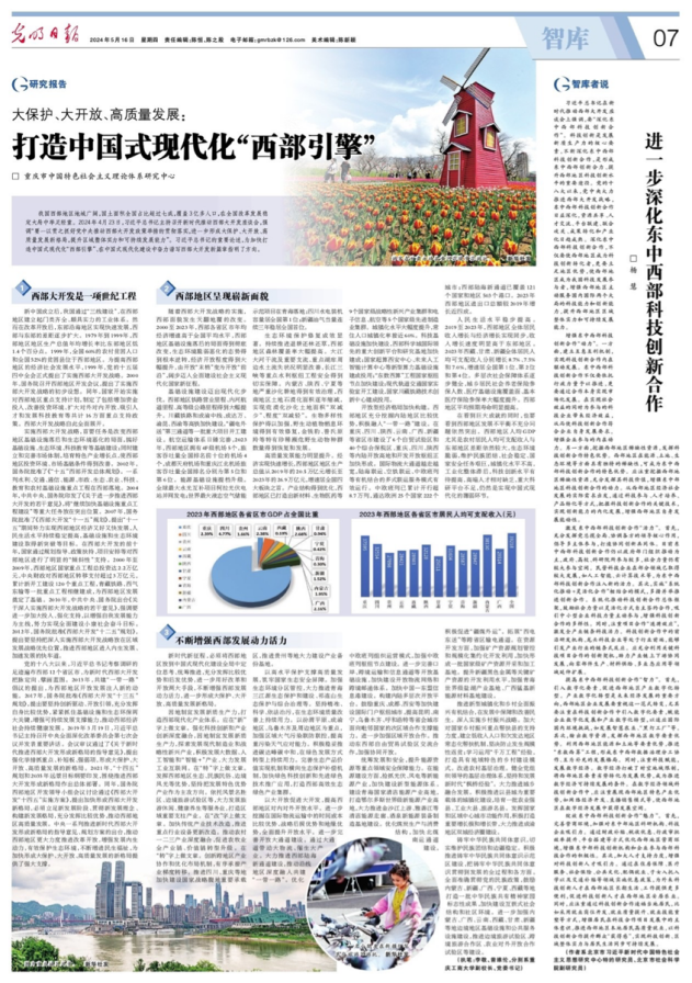 5月16日,《光明日报》智库版刊登beat365副校长李敬和党委书记曾维伦撰写的关于贯彻落实习近平总书记重要讲话重要指示精神的研究报告《大保护、大开放、高质量发展:打造中国式现代化“西部引擎”》。该报告聚焦加快打造中国式现代化“西部引擎”、在中国式现代化建设中奋力谱写西部大开发新篇章这个主题,从“西部大开发是一项世纪工程”“西部地区呈现崭新面貌”“不断增强西部发展动力活力”等三个方面展开论述。