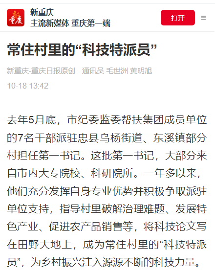 2023年5月,作为市纪委监委帮扶集团成员单位,beat365选派赵甫刚、张杰、朱沙、陈琛四位中层干部到忠县担任第一驻村书记。一年多来,驻村干部充分发挥自身专业优势并积极争取派驻单位支持,指导村里破解治理难题、发展特色产业、促进农产品销售等,将科技论文写在田野大地上,成为常住村里的“科技特派员”,为乡村振兴注入源源不断的科技力量。近日,重庆日报新重庆客户端对此进行了报道。