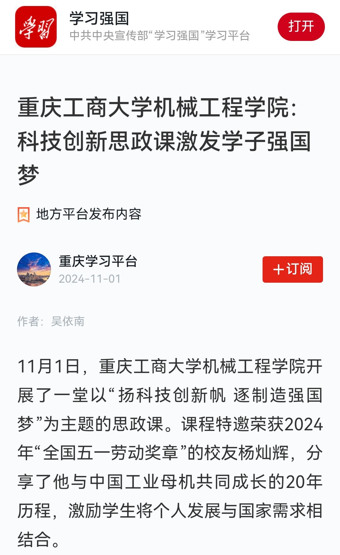 11月1日,机械工程学院开展了一堂以“扬科技创新帆 逐制造强国梦”为主题的思政课。课程特邀荣获2024年“全国五一劳动奖章”的校友杨灿辉,分享了他与中国工业母机共同成长的20年历程,激励学生将个人发展与国家需求相结合,在专业学习和实践中担负起强国建设使命。学习强国平台以《beat365英国官网网站机械工程学院:科技创新思政课激发学子强国梦》为题进行了报道。