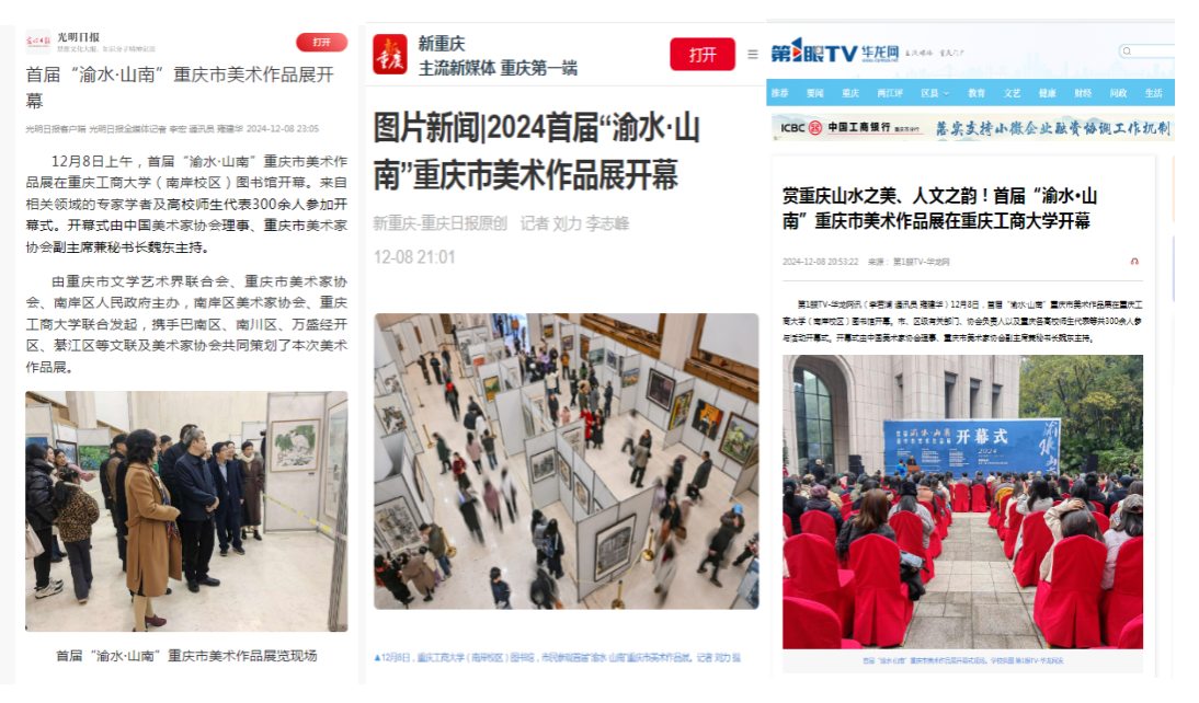 光明日报、重庆日报、华龙网等分别以《首届“渝水·山南”重庆市美术作品展开幕》《2024首届“渝水·山南”重庆市美术作品展开幕》《赏重庆山水之美、人文之韵!首届“渝水·山南”重庆市美术作品展在beat365英国官网网站开幕》为题,报道美术作品展。