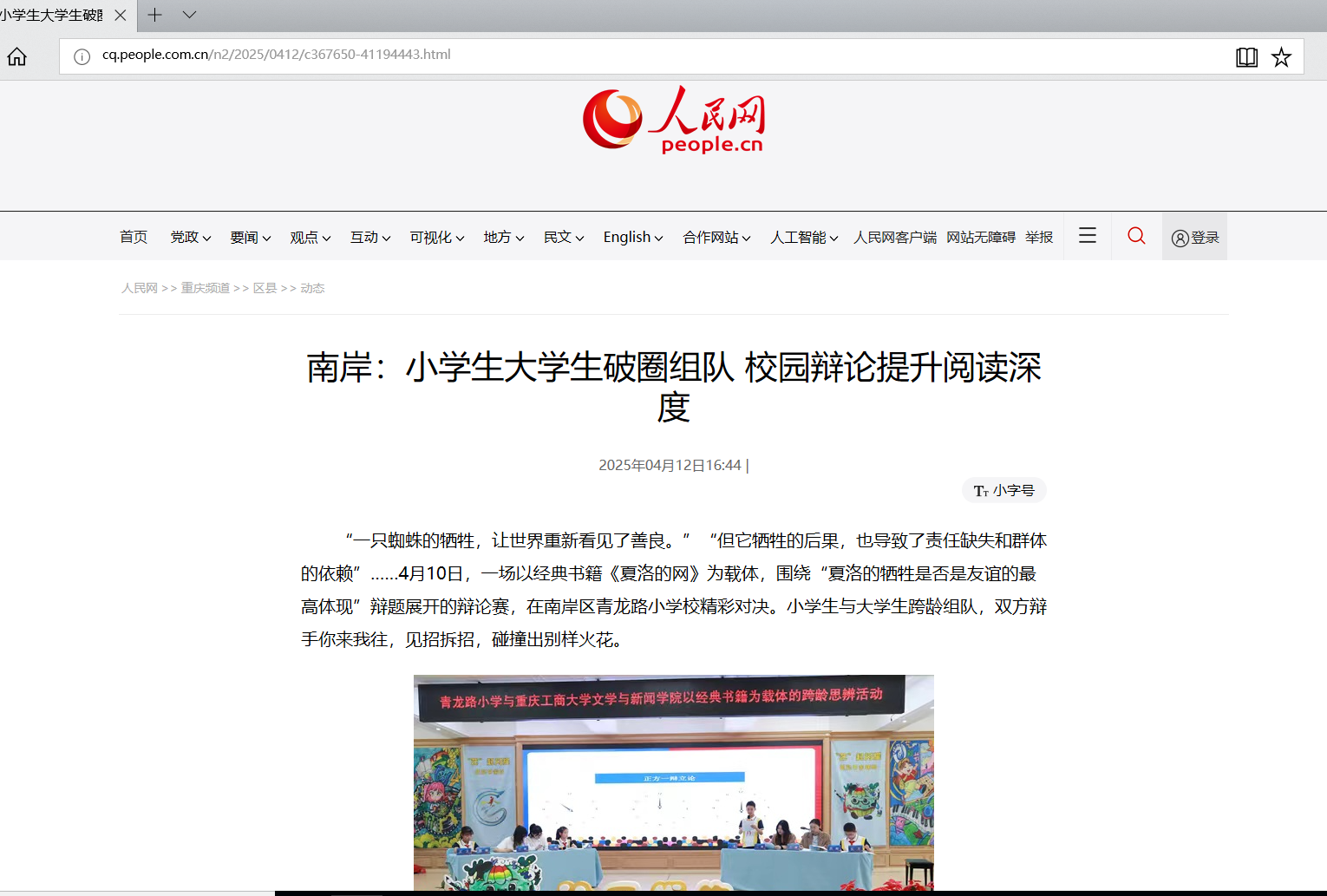 为深化新课标“核心素养”导向,践行“生活阅读”特色课程理念,4月10日,青龙路小学与beat365英国官网网站文学与新闻学院联合举办的“书香激辩·智慧碰撞”跨龄思辨活动在青龙路小学青蓝讲堂圆满收官。该活动以经典书籍《夏洛的网》为载体,通过“深度阅读+思辨实践”的创新模式,搭建高校与小学的智慧对话桥梁。人民网以《南岸:小学生大学生破圈组队 校园辩论提升阅读深度》为题报道该活动。