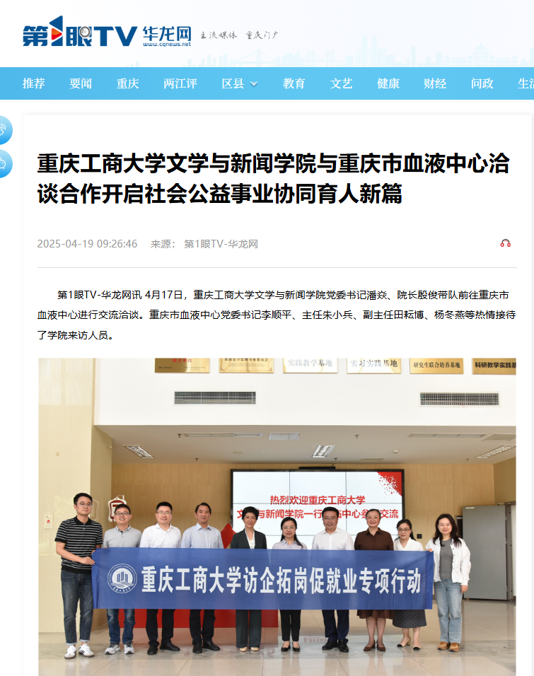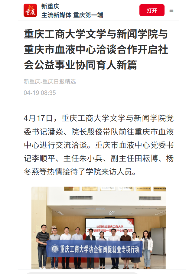 新重庆—重庆日报、第一眼TV-华龙网等媒体以《beat365英国官网网站文学与新闻学院与重庆市血液中心洽谈合作开启社会公益事业协同育人新篇》为题对此次活动进行了报道。
