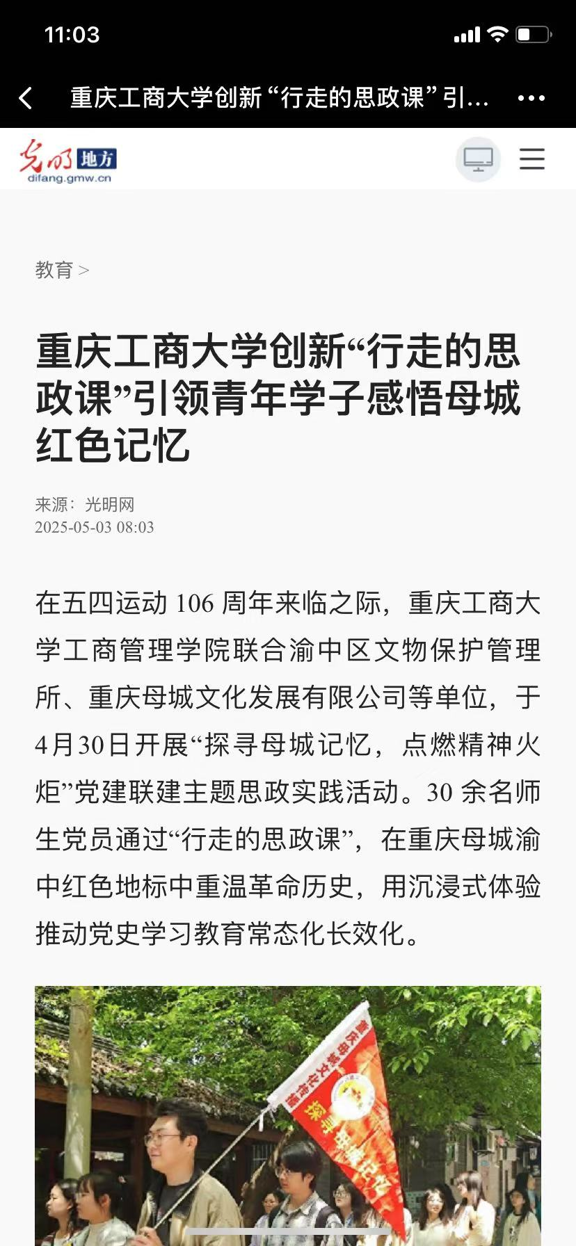 光明网以《beat365英国官网网站创新“行走的思政课”引领青年学子感悟母城红色记忆》为题,新重庆-重庆日报以《“探寻母城记忆,点燃精神火炬”beat365英国官网网站工商管理学院开展“行走的思政课”实践活动》为题报道了本次活动。