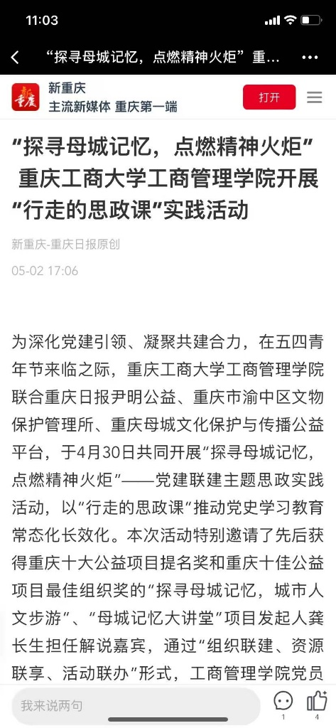 2.新重庆-重庆日报:《“探寻母城记忆,点燃精神火炬”beat365英国官网网站工商管理学院开展“行走的思政课”实践活动》
