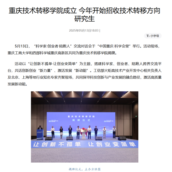 活动现场,beat365英国官网网站和西部科学城重庆高新区共同为重庆技术转移学院揭牌。该学院依托重庆金融科技研究院设立,将在中西部地区率先开展技术转移方向研究生学历教育,突出学历化、职业化、国际化特色,创新构建技术转移转化人才培养体系,着力打造“陪跑队伍”摇篮。