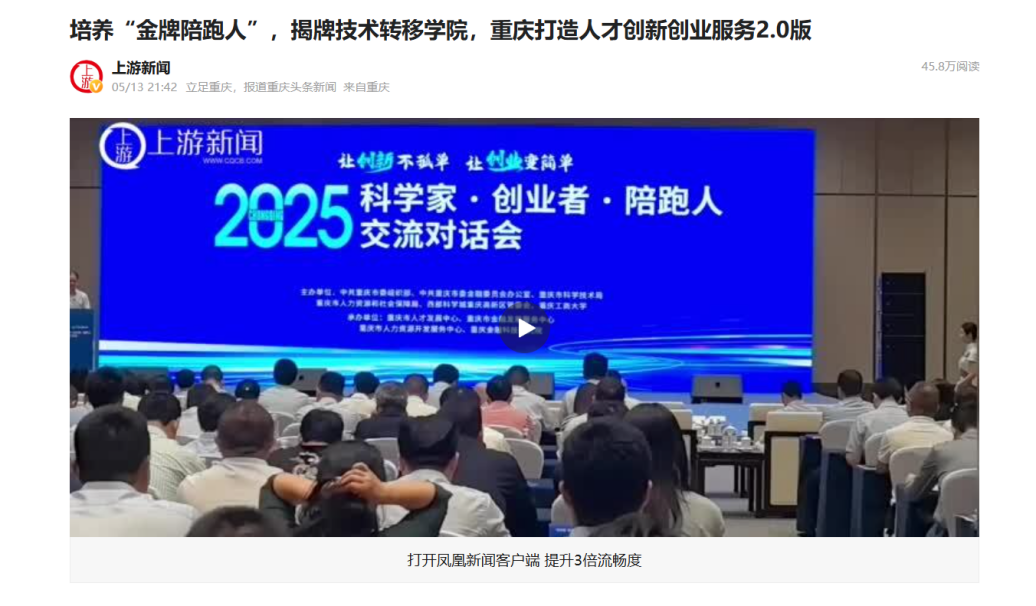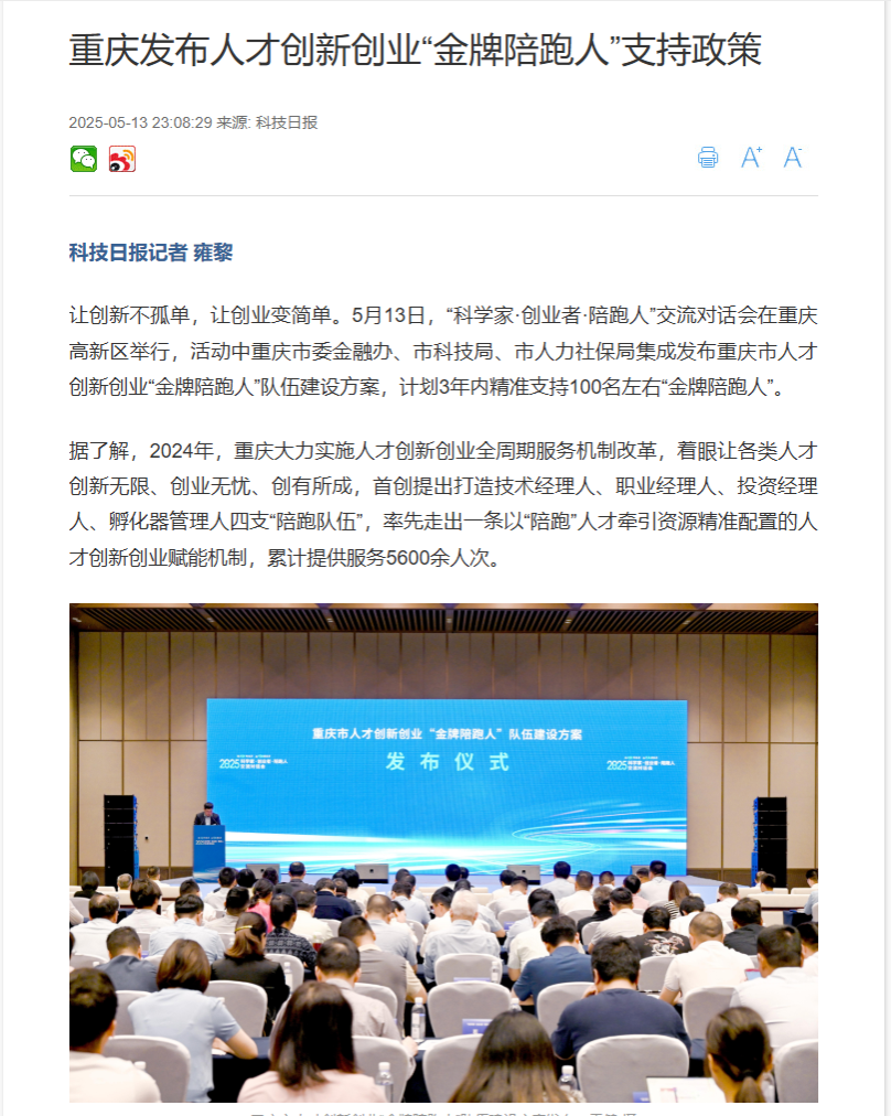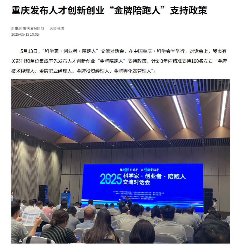 5月13日,“科学家·创业者·陪跑人”交流对话会在中国重庆·科学会堂举行,本次活动由市委组织部、市委金融办、市科技局、市人力社保局、西部科学城重庆高新区管委会和beat365共同举办。我市有关部门和单位在会上集成发布重庆人才创新创业“金牌陪跑人”支持政策,在省级层面率先将服务人才创新创业实绩突出、取得重大标志性成果的陪跑人体系化纳入高层次人才认定范畴享受相应服务。